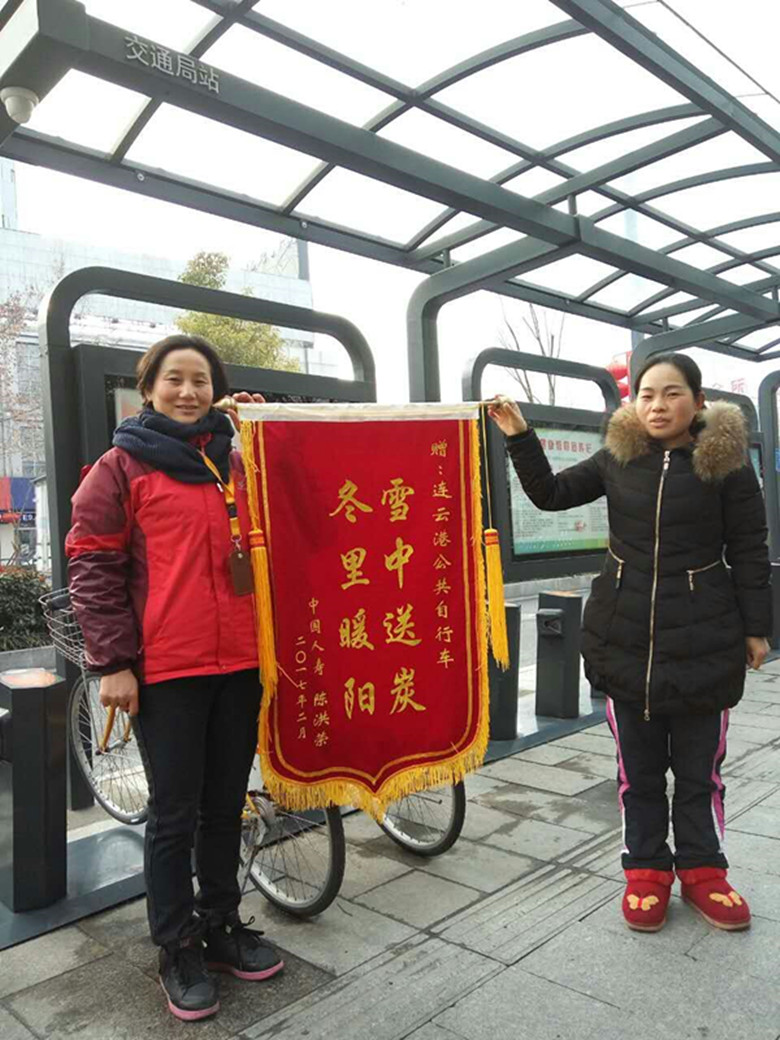 2月13號(hào)下午,公共自行車站點(diǎn)管理員楊雪在交通局公共自行車站點(diǎn)像平常一樣檢查車輛時(shí),在車籃里發(fā)現(xiàn)有一份中國(guó)人壽保險(xiǎn)公司的保險(xiǎn)單,想想此時(shí)此刻失主應(yīng)該很著急,在向公共自行車管理部后臺(tái)服務(wù)中心匯報(bào)后,立即與保險(xiǎn)單業(yè)務(wù)員聯(lián)系,把保險(xiǎn)單交給了業(yè)務(wù)員,讓她幫忙在最短時(shí)間內(nèi)聯(lián)系上失主,不要讓失主著急。經(jīng)過保險(xiǎn)業(yè)務(wù)員的努力,終于聯(lián)系上了失主。中國(guó)人壽業(yè)務(wù)員陳洪榮專程找到正在站點(diǎn)工作中的楊雪,拿著錦旗向她連連道謝:“感謝公共自行車部有如此優(yōu)秀的員工”并給她送上了一面“雪中送炭 冬里暖陽(yáng)”錦旗。