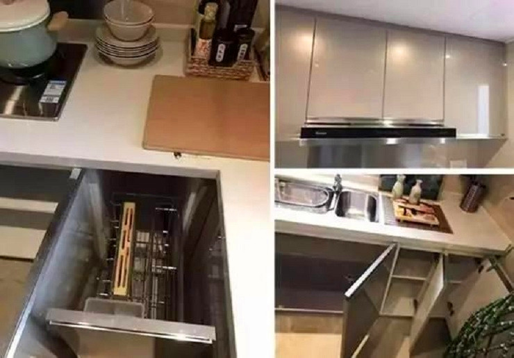 ·廚房:L型的廚房,拓展不少收納空間,上下方的櫥柜,有使用到拉籃與移動隔板的設(shè)計,讓儲物空間更為靈動。