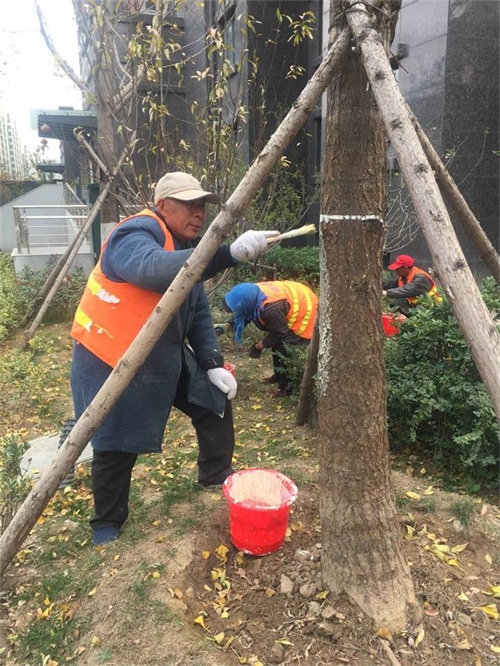 一般綠化用的涂白劑通常是由水、生石灰、石硫合劑原液、食鹽、油脂等物按比例配制。主要作用有樹木保溫不受凍害、防蟲病害、美化樹木、推遲花期等。此次涂白工作涉及的樹木種類有國槐、櫸樹、欒樹、大葉女貞、香樟、銀杏、苦楝、櫻花、紫葉李、紫薇等,確保每棵樹不漏,既保證質(zhì)量又保證美觀。在做好涂白工作的同時(shí),金潮公司還對容易受凍苗木采取裹草簾和纏保溫布等措施,確保苗木健康生長,營造景色迷人的綠化環(huán)境。