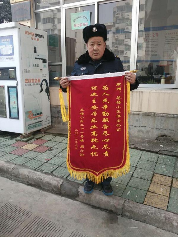 信中表示,該業(yè)主一人獨居,平時工作較忙,此前先后有三次沒有將住宅門和倉庫門關(guān)緊,幸得保安隊長陳瑞及同事巡邏時及時發(fā)現(xiàn),并第一時間聯(lián)系該業(yè)主,才消除安全隱患,避免財務(wù)損失。為此該業(yè)主特地寫下感謝信,連同一面寫著“為人民辛勤服務(wù)盡心盡責,保業(yè)主安居樂業(yè)高枕無憂”字樣的錦旗,一并送至蒼梧物業(yè)。