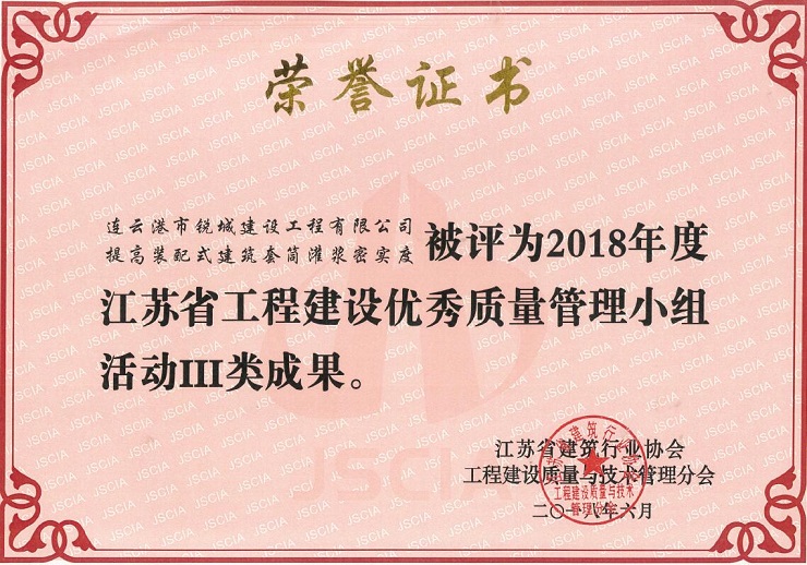 近日,建工集團(tuán)銳城公司生產(chǎn)部發(fā)布的《提高裝配式建筑套筒灌漿密實度》QC成果從眾多優(yōu)秀成果中脫穎而出,獲得“2018年度江蘇省工程建設(shè)優(yōu)秀質(zhì)量管理小組III類成果”獎。