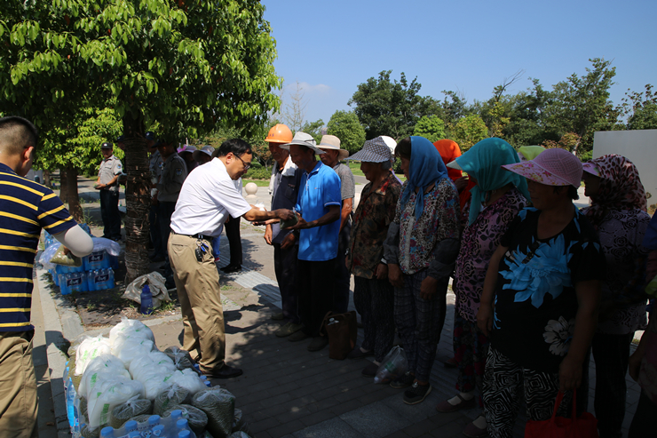 孟總一行先后來到了星海湖公園、花果名苑、杏壇路、連云港大劇院、美食水岸、大數(shù)據(jù)中心等項目現(xiàn)場,將毛巾、綠豆、白糖、水等防暑降溫物資送到工人們手中,對他們頭頂烈日、堅守崗位、一絲不茍的工作態(tài)度表示感謝,同時叮囑他們要注意勞逸結(jié)合,做好防暑降溫,注意施工安全。