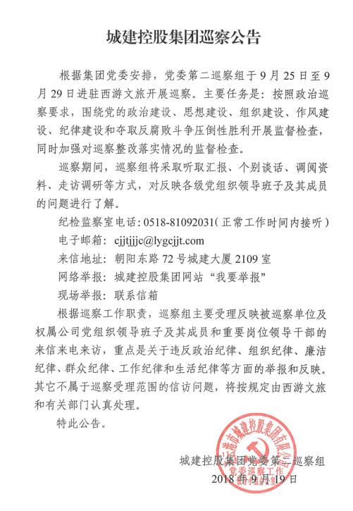 集團(tuán)黨委第二巡察組對(duì)西游文旅開(kāi)展巡察公告