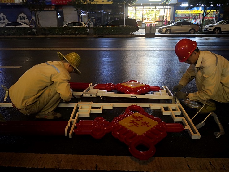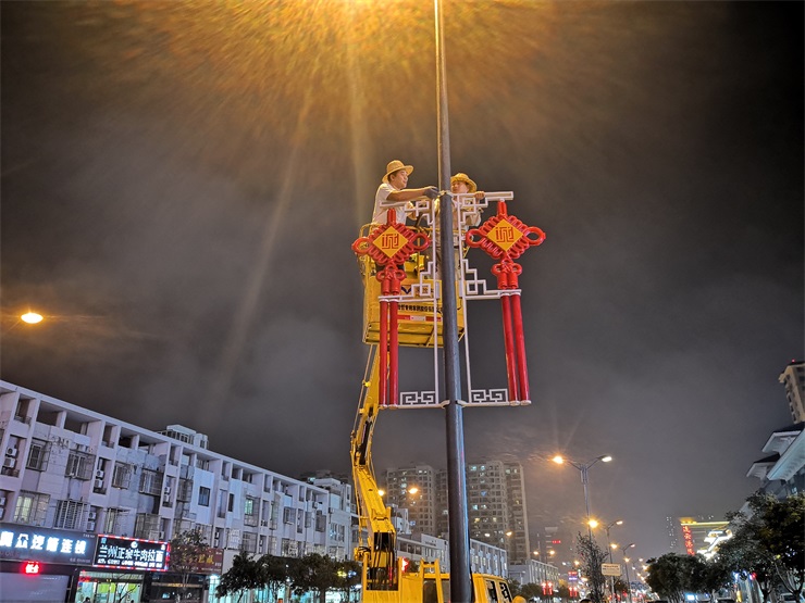 接到任務(wù)后,市政公用公司快速反應(yīng)、精心組織,具體由星辰照明公司負(fù)責(zé)實(shí)施,其中巨龍南路共需在97套燈桿上懸掛中國結(jié)燈飾,因該路段白天車流量大,為減少安裝給市民交通出行帶來不利影響,星辰照明利用夜晚進(jìn)行施工。