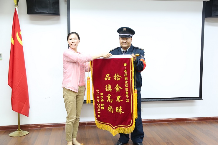 為表示感激,30日下午,失主親自將書有“拾金不昧,品德高尚”的錦旗送到蒼梧物業(yè),并對(duì)蒼梧物業(yè)保安人員拾金不昧的精神以及細(xì)致服務(wù)業(yè)主的工作態(tài)度表示高度贊揚(yáng)。