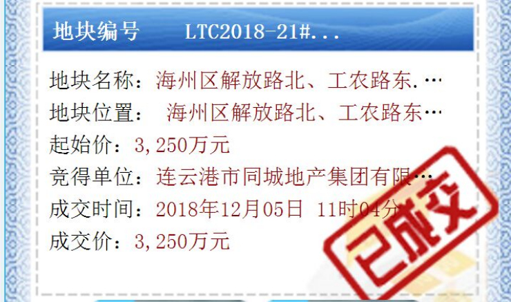 2018年12月5日上午,同城地產(chǎn)以起始價3250萬元競得LTC2018-21#地塊。