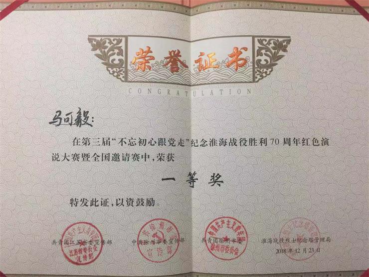 為紀(jì)念淮海戰(zhàn)役勝利70周年,深入學(xué)習(xí)宣傳貫徹黨的十九大精神和習(xí)近平總書記視察徐州重要指示,在青年群體中傳承紅色基因、激發(fā)愛國(guó)主義情感,12月23日下午,由團(tuán)省委主辦的“2018‘不忘初心跟黨走’紀(jì)念淮海戰(zhàn)役勝利70周年紅色演說大賽”暨全國(guó)邀請(qǐng)賽在徐州淮海戰(zhàn)役紀(jì)念館多功能廳舉行,集團(tuán)團(tuán)委選送的市政公用馬可毅同志作為我市唯一代表選手在比賽中獲得一等獎(jiǎng)。
