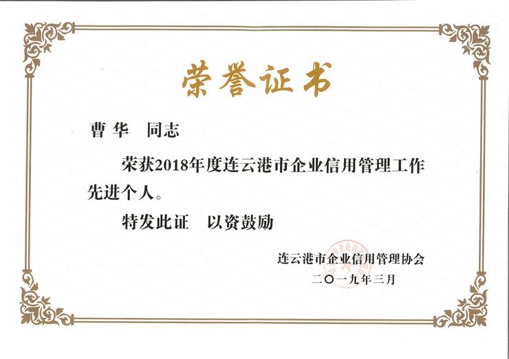 近日,在連云港市企業(yè)信用管理協(xié)會主辦的“守合同重信用”先進評選活動中,建工集團銳城建設(shè)公司總經(jīng)理曹華榮獲市企業(yè)信用管理工作“先進個人”榮譽稱號。