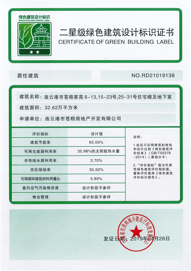 近日,從江蘇省住房和城鄉(xiāng)建設(shè)廳科技發(fā)展中心傳來(lái)好消息,蒼梧家苑項(xiàng)目榮獲二星級(jí)綠色建筑設(shè)計(jì)標(biāo)識(shí),并正式下發(fā)標(biāo)識(shí)證書(shū)。