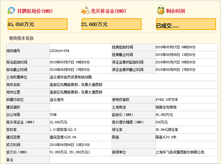 6月6日上午12時,同城地產(chǎn)集團申請掛牌的LTC2019-07#地塊經(jīng)過各家房企的激烈角逐,最終以51050萬元由上海華飛投資集團股份有限公司競得。