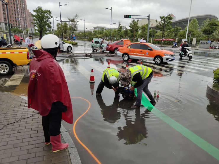 公司組織精干力量對建成區(qū)60公里長的道路、全部的雨污水設(shè)施和城市家具及180萬平方米道路綠化、街頭綠地、公園綠地進行全面排查。由于風(fēng)大雨急,現(xiàn)場市政工作人員發(fā)現(xiàn)學(xué)院路淮海工學(xué)院路段以及其它幾處低洼地方的雨水來不及排走而造成積水,影響出行,迅速調(diào)集水泵進行強排,保障道路通行。園林綠化工作人員迅速組織、加派人員對片區(qū)內(nèi)綠地進行認真巡視、排查、加固、清理,及時處理突發(fā)情況,排除各種安全隱患。安排專人開展倒伏樹木排查,第一時間到場處理,最大程度地減少倒伏樹木對交通的影響。同時,公司積極與高新區(qū)城管、交警部門信息聯(lián)動,全力保障出行群眾生命財產(chǎn)安全和片區(qū)內(nèi)道路安全暢通。