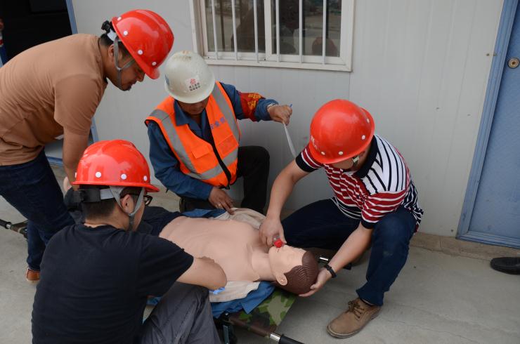 本次演練充分結(jié)合項(xiàng)目實(shí)際情況,邀請(qǐng)紅十字會(huì)教員現(xiàn)場(chǎng)指導(dǎo)教學(xué),講解應(yīng)急救援的動(dòng)作要領(lǐng)以及中暑后必須采取的措施?,F(xiàn)場(chǎng)演練過(guò)程中,工作人員井然有序、忙而不亂、分工明確,一系列連貫動(dòng)作,順利完成了現(xiàn)場(chǎng)救援。隨后又進(jìn)行現(xiàn)場(chǎng)模擬火情發(fā)生救援活動(dòng),全體人員對(duì)滅火器的使用、火災(zāi)傷員救援以及逃生疏散等項(xiàng)目進(jìn)行了實(shí)操演練。