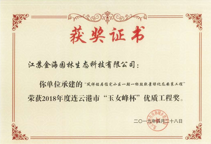 近日,由金潮公司權(quán)屬金海園林承建的鳳祥銘居住宅小區(qū)景觀綠化工程項(xiàng)目榮獲連云港市城鄉(xiāng)建設(shè)局頒發(fā)的2018年度連云港市“玉女峰杯”優(yōu)質(zhì)工程獎(jiǎng)。