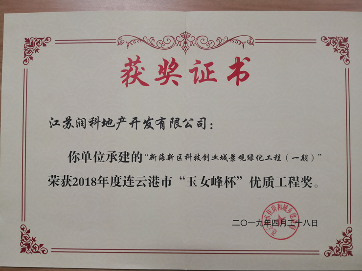 近日,根據(jù)連云港市住房和城鄉(xiāng)建設(shè)局關(guān)于公布2018年度連云港市“玉女峰杯”優(yōu)質(zhì)工程項(xiàng)目獎(jiǎng)的決定(連建質(zhì)〔2019〕167號(hào)),潤(rùn)科集團(tuán)共計(jì)5項(xiàng)綠化工程同時(shí)榮獲2018年度連云港市“玉女峰杯”優(yōu)質(zhì)工程項(xiàng)目獎(jiǎng)。
