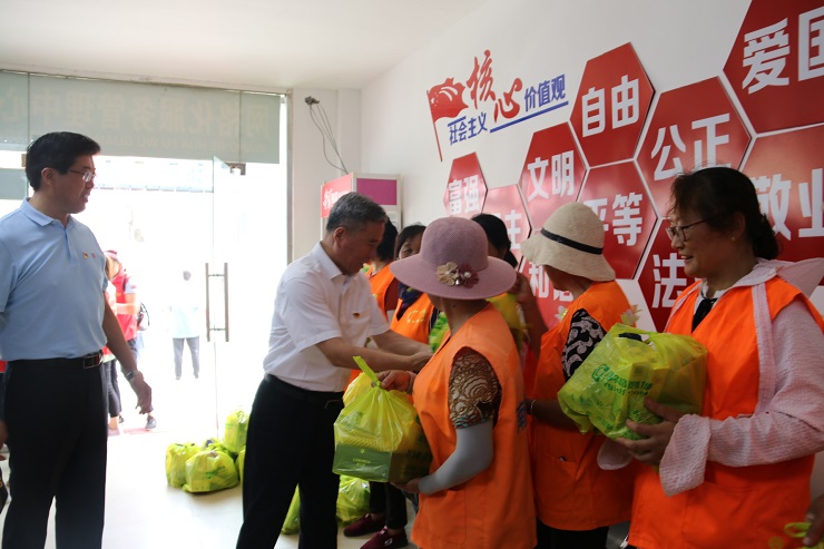 在鳳凰社區(qū)居委會(huì),張標(biāo)遠(yuǎn)副書記為街道40余名環(huán)衛(wèi)人員贈(zèng)送了綠豆、毛巾、花露水等防暑降溫物品,并親切的詢問環(huán)衛(wèi)人員的創(chuàng)文期間工作情況,叮囑他們炎熱天氣下工作要注意防暑、保重身體。