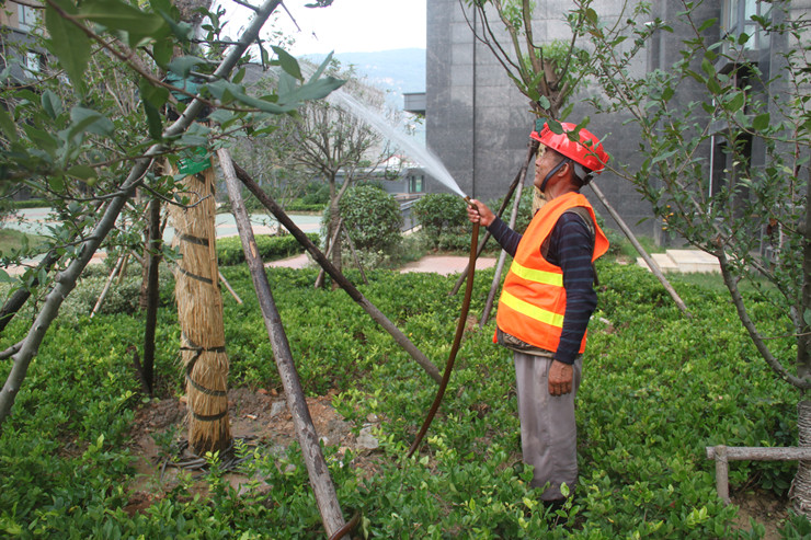 一是積極做好苗木澆灌工作,合理安排澆水時間,避開中午高溫時段,在不具備自動澆灌系統(tǒng)的條件下,養(yǎng)護(hù)人員靠雙手用力拖著水管對苗木進(jìn)行澆灌。針對新栽種的苗木,采取每天灌水與噴淋相結(jié)合的方式進(jìn)行養(yǎng)護(hù)的同時采用防曬網(wǎng)進(jìn)行遮擋保護(hù)。二是加強監(jiān)測和預(yù)警,做好高溫期間的病蟲害防治工作,針對夏季苗木易發(fā)的蚜蟲病、介殼蟲病等情況,全面做好苗木病蟲害預(yù)防,并針對不同蟲害特性制定切實可行的防治措施。 三是加強科學(xué)養(yǎng)護(hù)管理,積極做好雜草拔除及樹木修剪工作,主要剪除枯枝、斷枝及病蟲枝,改善樹木通風(fēng)透氣,使水分養(yǎng)分集中,減少消耗。四是加強作業(yè)人員安全防范,盡量避開高溫作業(yè),選擇在早晚氣溫相對較低時進(jìn)行綠化養(yǎng)護(hù)作業(yè)。