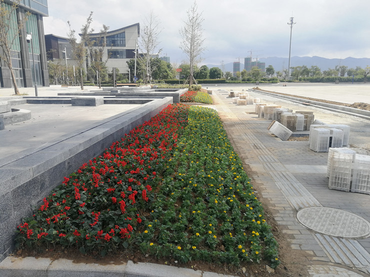 原有綠化改造增植品種為:夾竹桃、紅葉石楠、矮麥冬、孔雀草、牽牛、一串紅等,通過各種形狀及不同花色的搭配來提高整體景觀綠化觀賞性。新增景觀區(qū)栽植品種為:大葉女貞、黑松、雞爪槭、海棠、晚櫻及多品種色塊。為確保工程順利推進,在十月按期完工,金海園林公司倒排工期,制定詳細施工方案,克服諸多困難,確保了在時間節(jié)點內完成施工任務。