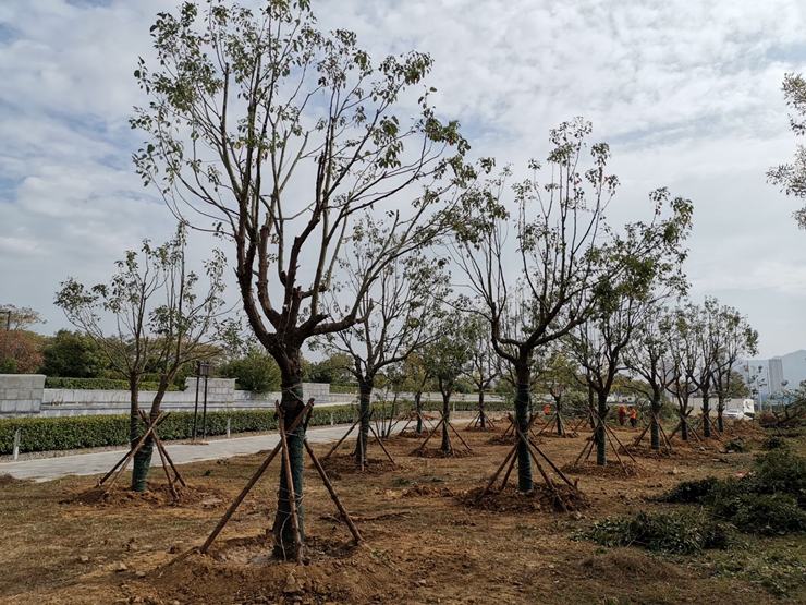 因多為大型喬木,現(xiàn)場(chǎng)對(duì)苗木起挖規(guī)定了嚴(yán)格的步驟要求,先進(jìn)行草繩繞桿,對(duì)苗木根部位置進(jìn)行切根處理,對(duì)苗木土球進(jìn)行草繩包裹,移栽前要對(duì)其進(jìn)行疏剪與回縮,保存樹(shù)木養(yǎng)分。本次移栽的苗木有香樟、銀杏、桂花、雞爪槭、櫸樹(shù)、櫻花、紫薇、泡桐、楊樹(shù)球等共計(jì)140余株,色塊苗780㎡,綠地面積4300㎡。被移植出來(lái)的苗木將種植到連云新城商務(wù)公園四周空地中。