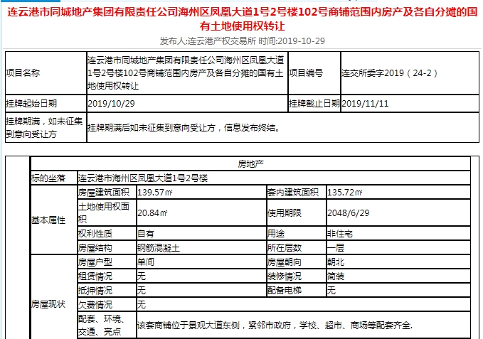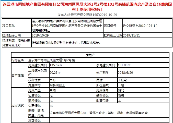 為了加快固定資產(chǎn)盤活,10月29日,同城地產(chǎn)對位于海州區(qū)鳳凰大道1號(hào)港城新世界2號(hào)樓范圍內(nèi)101、102號(hào)商鋪的房產(chǎn)及各自分?jǐn)偟膰型恋厥褂脵?quán)進(jìn)行公開掛牌轉(zhuǎn)讓。下一步,同城地產(chǎn)將積極配合產(chǎn)權(quán)交易所,協(xié)助受讓方辦理資產(chǎn)交接及變更手續(xù)。