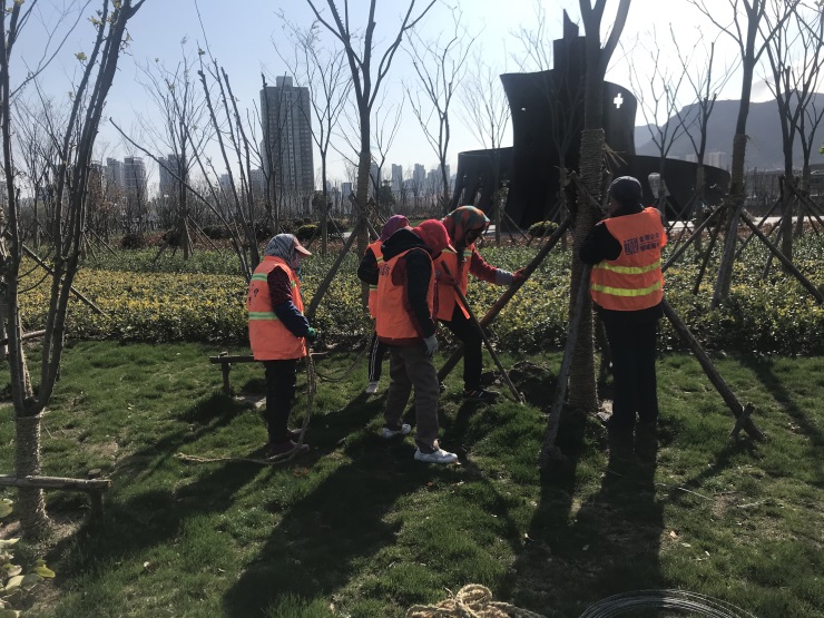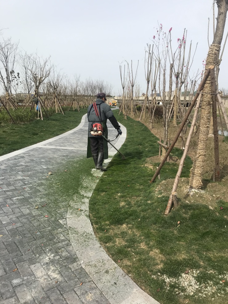 新絲路公園春季綠化養(yǎng)護(hù)管理主要針對(duì)新栽植苗木進(jìn)行重點(diǎn)加強(qiáng)養(yǎng)護(hù)。新栽植苗木根系還未生長(zhǎng),由于大風(fēng)天氣出現(xiàn)傾斜等情況,現(xiàn)場(chǎng)養(yǎng)護(hù)人員對(duì)出現(xiàn)傾斜的新栽植喬木進(jìn)行重新扶正并加固,同時(shí)根據(jù)現(xiàn)場(chǎng)施工需要,對(duì)新栽植的草坪進(jìn)行修剪,對(duì)雜草進(jìn)行清理,進(jìn)一步提升園區(qū)綠化品質(zhì)。