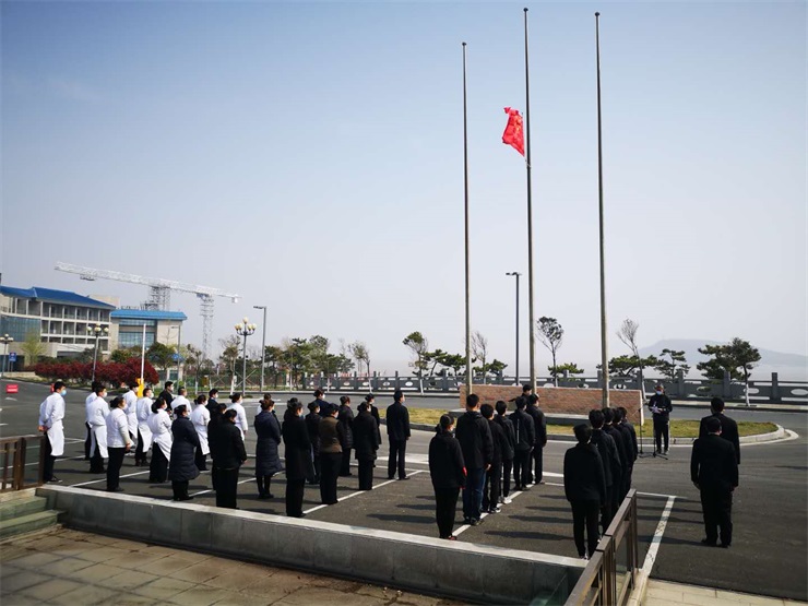 上午10:00海州灣會(huì)議中心護(hù)旗手升起國(guó)旗后緩緩將國(guó)旗降至離旗桿頂端1/3處,伴隨著令人警醒的汽笛聲,所有人員默哀三分鐘,現(xiàn)場(chǎng)氣氛莊嚴(yán)、肅穆。隨后海州灣會(huì)議中心、連云港市第一人民醫(yī)院分別發(fā)表悼詞,深切表達(dá)致敬烈士、緬懷同胞、感恩英雄之情。
