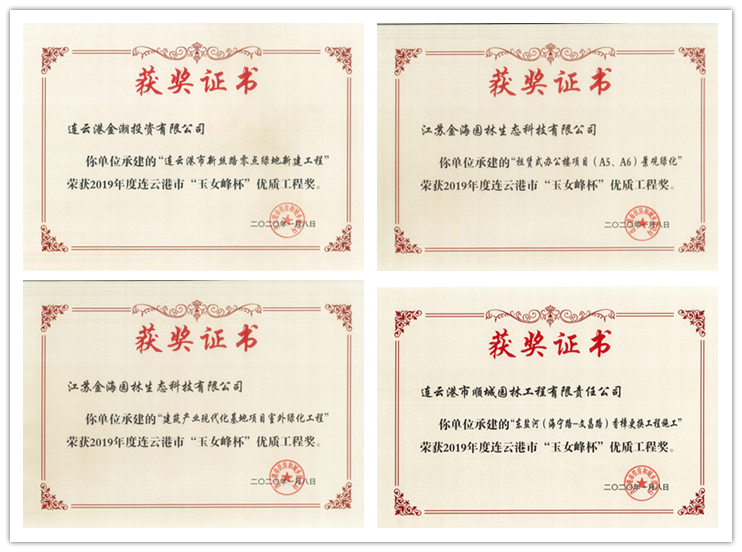 近日,由金潮公司承建的“連云港市新絲路零點綠地新建工程”,金海園林承建的租賃式辦公樓項目(A5、A6)景觀綠化”、“建筑產(chǎn)業(yè)現(xiàn)代化基地項目室外綠化工程”,順城園林承建的“東鹽河(海寧路-文昌路)香樟更換工程施工” 等四項工程榮獲連云港市城鄉(xiāng)建設(shè)局頒發(fā)的2019年度連云港市“玉女峰杯”優(yōu)質(zhì)工程獎。