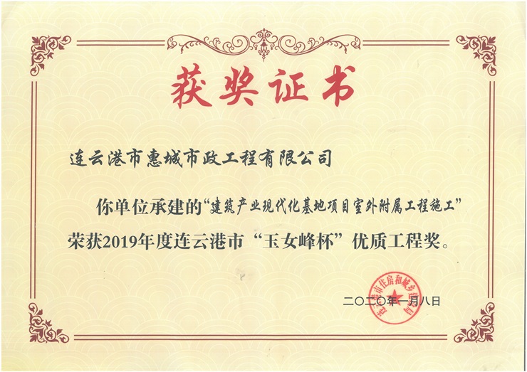 近日,從市建筑業(yè)協(xié)會傳來好消息,建工集團惠城市政公司承建的建筑產業(yè)現代化基地項目室外附屬工程施工喜獲連云港市“玉女峰杯”優(yōu)質工程獎。
