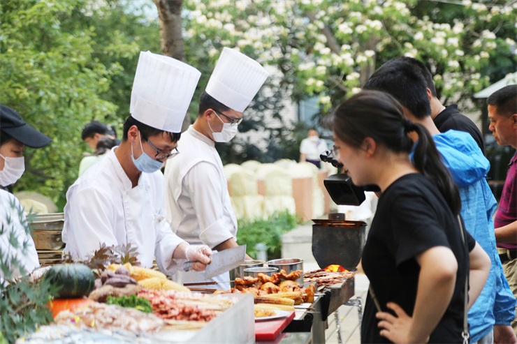 出于賓客用餐的舒適度和氛圍營造方面考慮,本次周末戶外自助沒有沿用以往的室內形式,而是將用餐場所調整為室內加戶外,打通室內外的空間約束感,憑借酒店采摘園內怡人的果木田園風讓賓客在愉悅中品嘗酒店的精制自釀啤酒和特色美食。