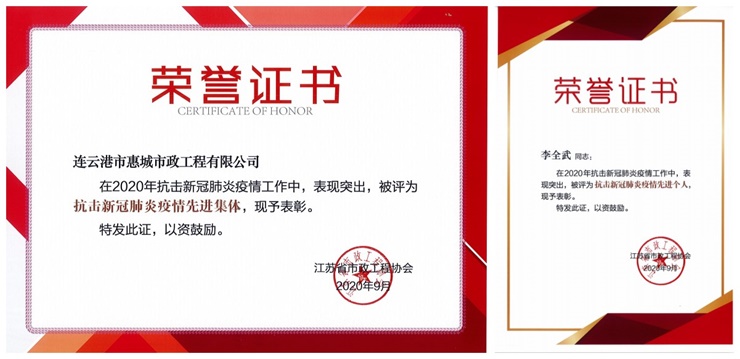 近日,從江蘇省市政工程協(xié)會(huì)傳來喜訊,連云港市建工集團(tuán)惠城市政作為抗擊疫情先進(jìn)集體,惠城市政總經(jīng)理李全武作為抗擊疫情先進(jìn)個(gè)人榮獲表彰。