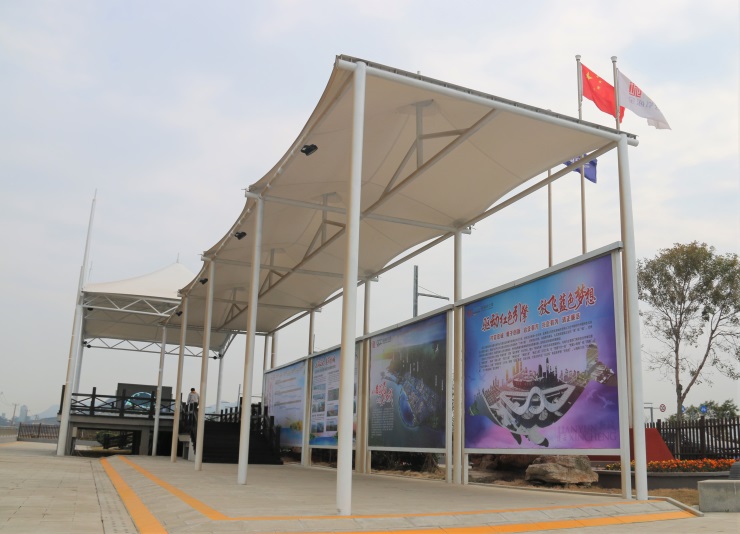 體驗(yàn)區(qū)占地約3000平米,主要由觀景平臺(tái)、參觀區(qū)、綠化、停車場(chǎng)等組成,區(qū)內(nèi)設(shè)有大型展板、沙盤、電子顯示屏等設(shè)施。體驗(yàn)區(qū)主要用于項(xiàng)目學(xué)習(xí)培訓(xùn)、黨建團(tuán)建活動(dòng)、接待外部單位參觀考察等,通過展板展示、實(shí)物展示、交流學(xué)習(xí)等方式,融合聲、像等效果,全方位、多層次、立體化地展示藍(lán)色海灣建設(shè)情況。參觀者置身其中,既能學(xué)習(xí)了解藍(lán)色海灣建設(shè)和連云新城發(fā)展情況,又能實(shí)地感受項(xiàng)目建設(shè)氛圍,真切了解項(xiàng)目進(jìn)度,實(shí)現(xiàn)理論與體驗(yàn)相結(jié)合的目的。