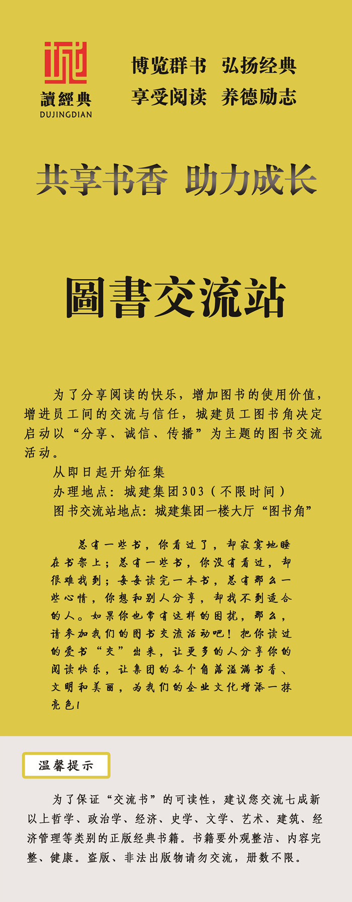 總有一些書,你看過了,卻寂寞地睡在書架上;總有一些書,你沒有看過,卻很難找到;每每讀完一本書,總有那么一些心情,你想和別人分享,卻找不到適合的人。如果你也常有這樣的困擾,那么,請參加我們的圖書交流活動吧!把你讀過的愛書“交”出來,讓更多的人分享你的閱讀快樂,讓集團的各個角落溢滿書香、文明和美麗,為我們的企業(yè)文化增添一抹亮色!
